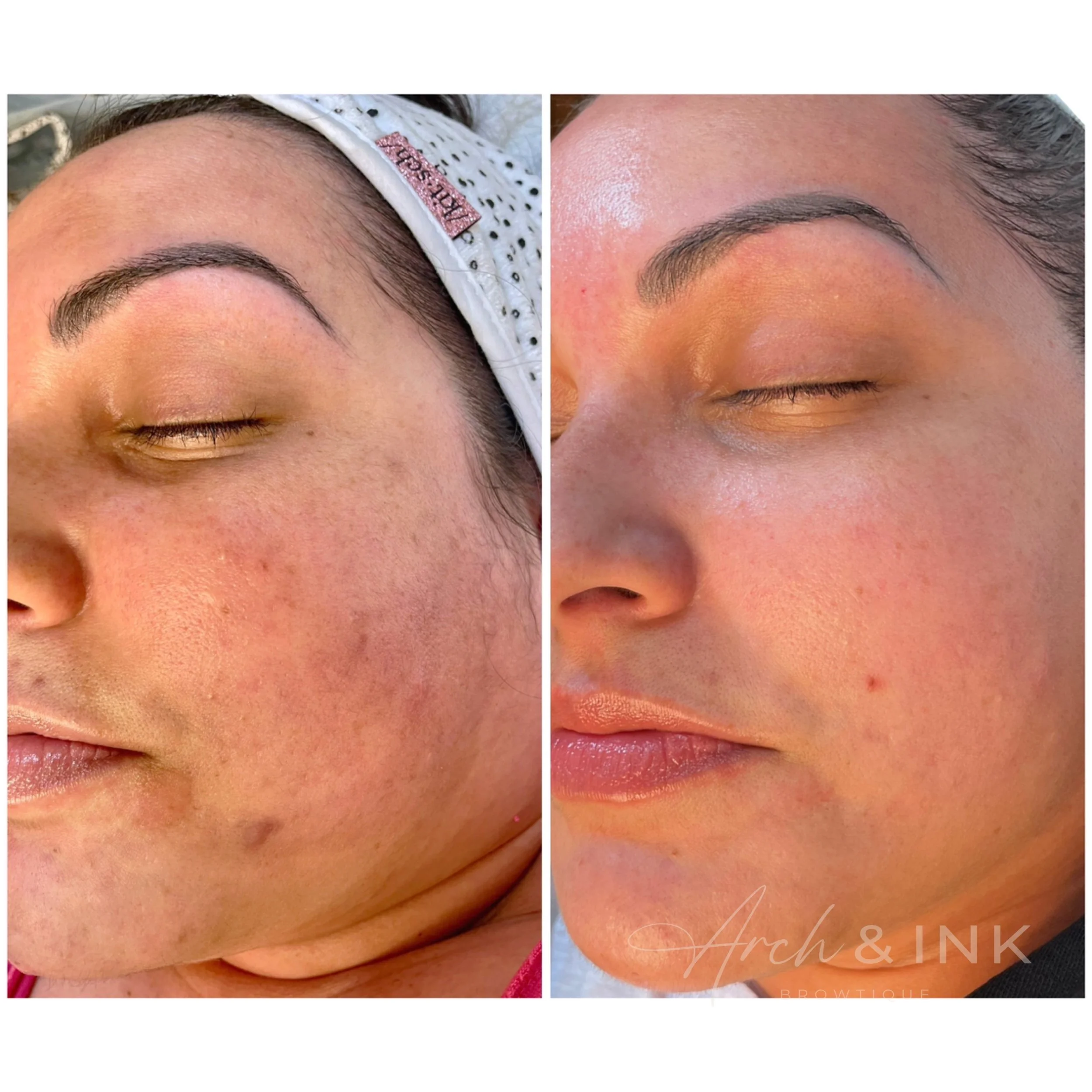Microchanneling creates invisible micro-channels that produce a clinically significant increase in the production of new collagen and elastin through the release of peptides, growth factors and cytokines. Additional benefits: helps reduce pore size, tightens and lifts skin, and helps reduce hyperpigmentation and scarring. This is after 3 sessions of Microochanneling and a great home. skincare routine.